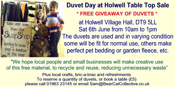 There will also be local crafts, bric-a-brac and refreshments at Holwell Village Hall Table Top Sale and SwapShop, DT9 5LN. Anyone wishing to reserve a quantity of duvets, or book a table (£5) please call 01963 23145 or email Sam@BearCatCollective.co.uk.